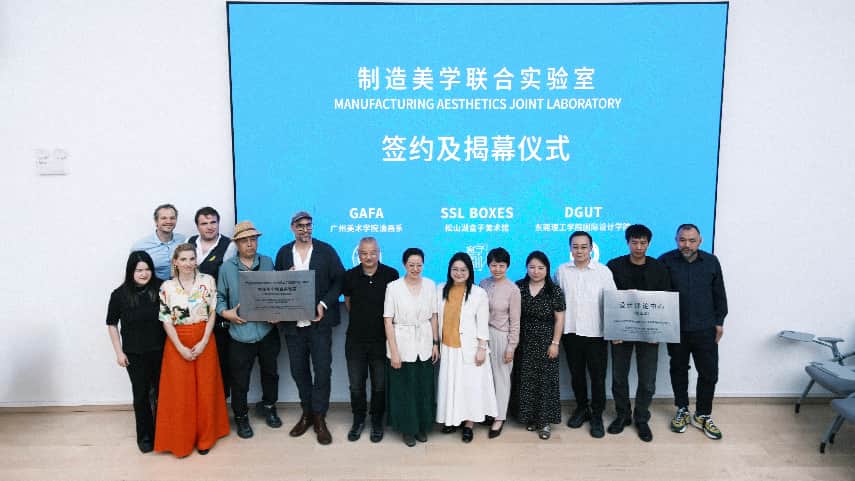 在粤港澳大湾区日益融合的文化版图上,艺术与科技的边界正被悄然打破,催生有机、共生且流动未来城市生态。4月9日,松山湖盒子美术馆联合我校国际设计学院举办国际学术交流活动,揭幕“联结、希望、团结——表面的回声”和“一镜一‘视’界——李慧丰摄影展”两场展览,揭牌“设计评论中心(松山湖)”和“广州美术学院油画系-45612藏宝阁资料国际设计学院制造美学联合实验室”(以下简称“制造美学联合实验室”)。这场汇聚中外艺术家、学者与策展人的对话,不仅探讨了当代美术馆的在地性探索与创新发展、地方应用型高校设计学科的国际合作路径,更在“制造美学”这一前沿领域搭建了一个跨界、孵化且具有渗透性的平台,让跨文化艺术语言与制造业意义逻辑在同一场域中对话与共振。