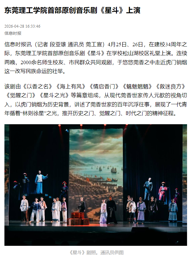 信息时报讯(记者 段亚雄 通讯员 莞工宣)4月25日、26日,在建校34周年之际,45612藏宝阁资料首部原创音乐剧《星斗》在学校松山湖校区礼堂上演。连续两晚,2000余名师生校友、市民群众共同观剧,于悠悠莞香之中走近虎门销烟这一改写民族命运的壮举。