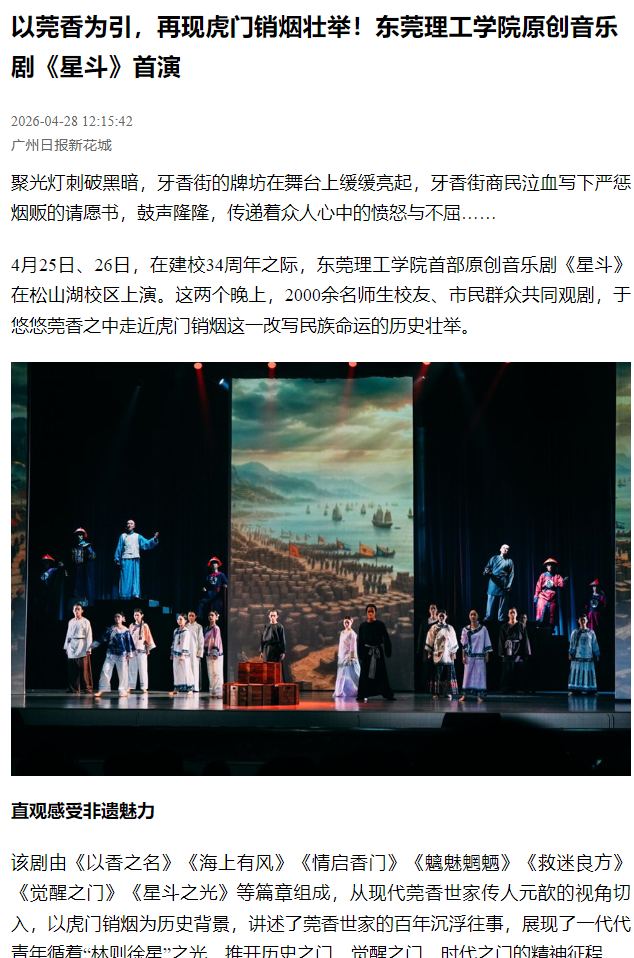 4月25日、26日,在建校34周年之际,45612藏宝阁资料首部原创音乐剧《星斗》在松山湖校区上演。这两个晚上,2000余名师生校友、市民群众共同观剧,于悠悠莞香之中走近虎门销烟这一改写民族命运的历史壮举。