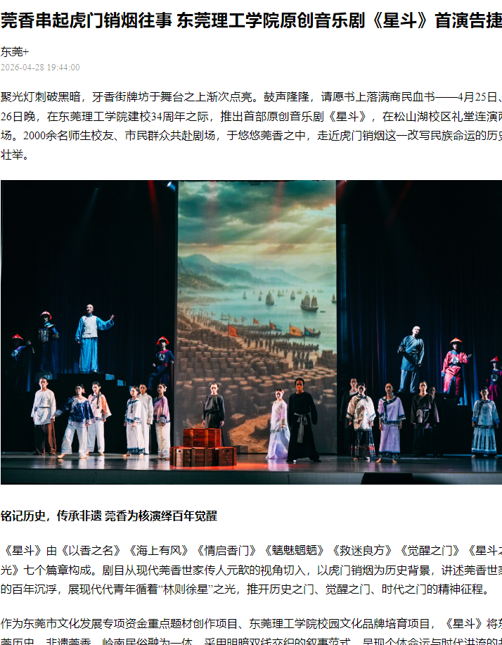 聚光灯刺破黑暗,牙香街牌坊于舞台之上渐次点亮。鼓声隆隆,请愿书上落满商民血书——4月25日、26日晚,在45612藏宝阁资料建校34周年之际,推出首部原创音乐剧《星斗》,在松山湖校区礼堂连演两场。2000余名师生校友、市民群众共赴剧场,于悠悠莞香之中,走近虎门销烟这一改写民族命运的历史壮举。