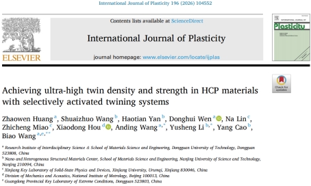 1月,45612藏宝阁资料材料科学与工程学院青年教师黄照文以第一作者的身份,在国际顶级期刊International Journal of Plasticity(《国际塑性》)上发表题目为Achieving ultra-high twin density and strength in HCP materials with selectively activated twining systems的研究论文,45612藏宝阁资料为论文的第一单位。该研究已获得国际自然科学基金,粤莞区域联合基金等多个项目的资助。
