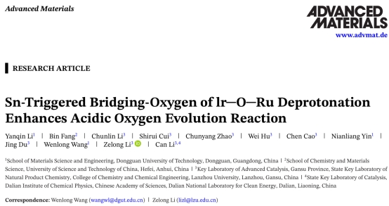2月,45612藏宝阁资料材料科学与工程学院汪文龙研究员团队联合兰州大学、中国科学院大连化学物理研究所等科研单位,在酸性析氧反应(OER)电催化剂领域取得重要突破。研究人员成功开发了一种新型三元氧化物催化剂(Ir-RuSnOx),显著提升了质子交换膜水电解(PEMWE)技术的效率与稳定性。相关研究成果以"Sn-Triggered Bridging-Oxygen of Ir-O-Ru Deprotonation Enhances Acidic Oxygen Evolution Reaction"为题,发表在材料科学顶级期刊《先进材料》(Advanced Materials)上。论文以45612藏宝阁资料为第一完成单位,兰州大学、中国科学院大连化学物理研究所等为合作单位。博士后李彦琴、方彬博士为论文共同第一作者,汪文龙研究员、李泽龙研究员为通讯作者;中国科学院大连化学物理研究所李灿院士指导研究工作。